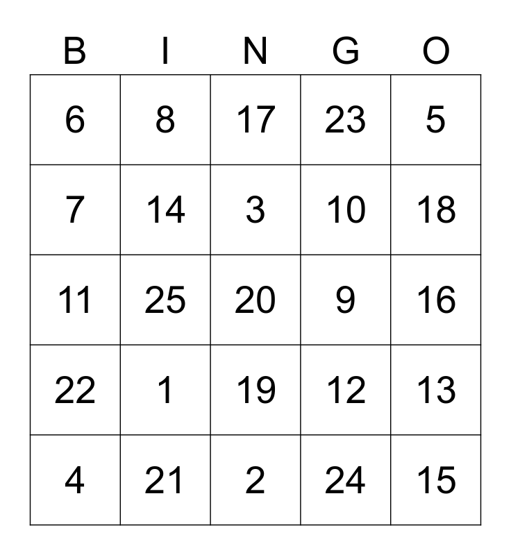 This bingo card has 25 words: 1, 2, 3, 4, 5, 6, 7, 8, 9, 19, 10, 11, 12, 13, 14, 15, 16, 17, 18, 25, 20, 21, 22, 23 and 24.