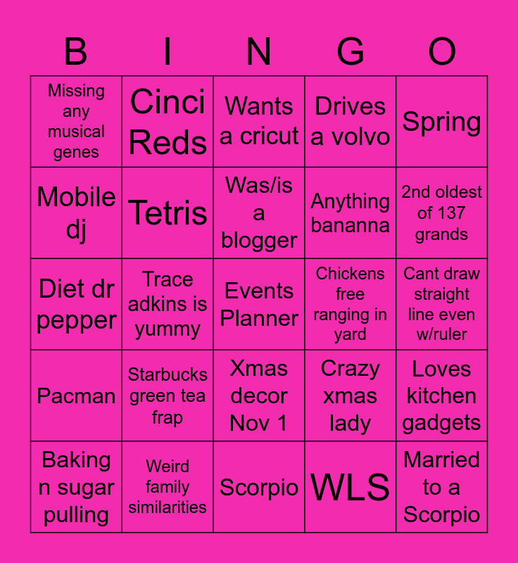 This bingo card has a free space and 34 words: Related to someone Famous, WLS, Know some ASL, Fibro, Pacman, Tetris, Spring, Baking n sugar pulling, Cinci Reds, Was/is a 📻personality, Was/is a blogger, Wants a cricut, Gramma, 2 cats 1 dog all spoiled, Chickens free ranging in yard, 2nd oldest of 137 grands, Weird family similarities, Diet dr pepper, Starbucks green tea frap, Crazy xmas lady, Xmas decor Nov 1, Been in a musical, Missing any musical genes, Cant draw straight line even w/ruler, Scorpio, Married to a Scorpio, Drives a volvo, Canned Spam, Anything bananna, Mobile dj, American pickers, Trace adkins is yummy, Loves kitchen gadgets and Loves purses.