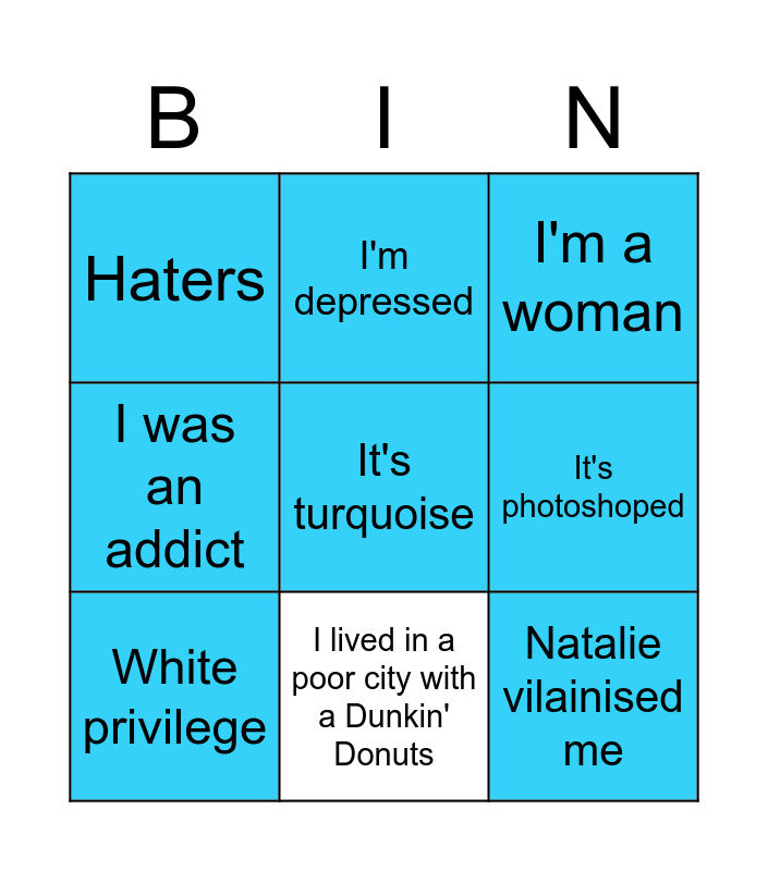 This bingo card has 9 words: White privilege, I'm a woman, I'm depressed, I was an addict, Haters, It's photoshoped, It's turquoise, Natalie vilainised me and I lived in a poor city with a Dunkin' Donuts.