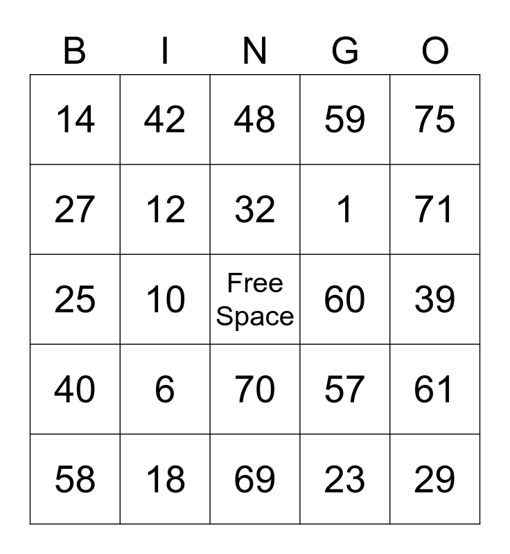 This bingo card has a free space and 24 words: 6, 18, 32, 58, 75, 14, 27, 42, 60, 70, 1, 25, 57, 61, 12, 23, 39, 48, 71, 10, 29, 40, 59 and 69.