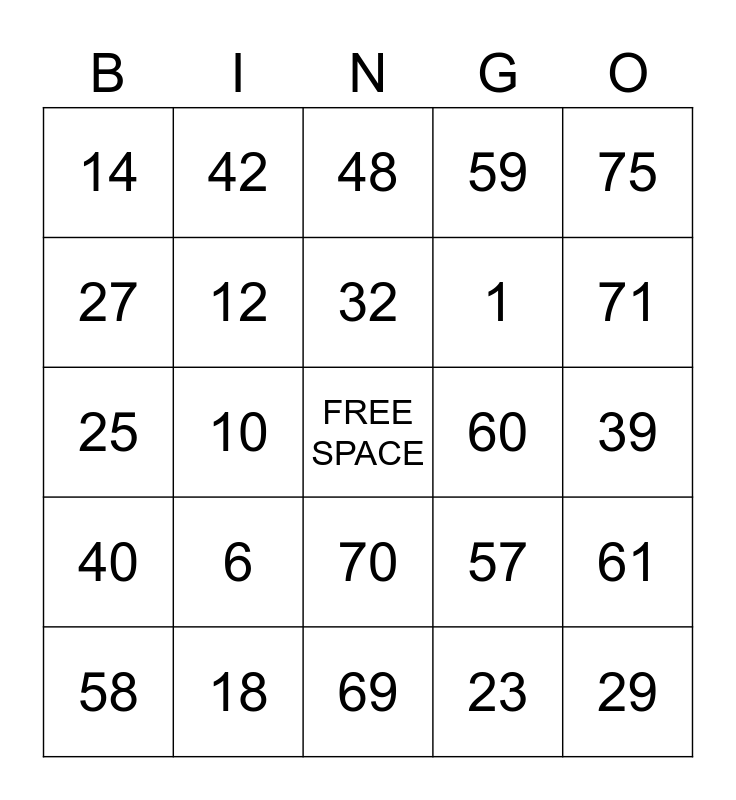 This bingo card has a free space and 24 words: 6, 18, 32, 58, 75, 14, 27, 42, 60, 70, 1, 25, 57, 61, 12, 23, 39, 48, 71, 10, 29, 40, 59 and 69.