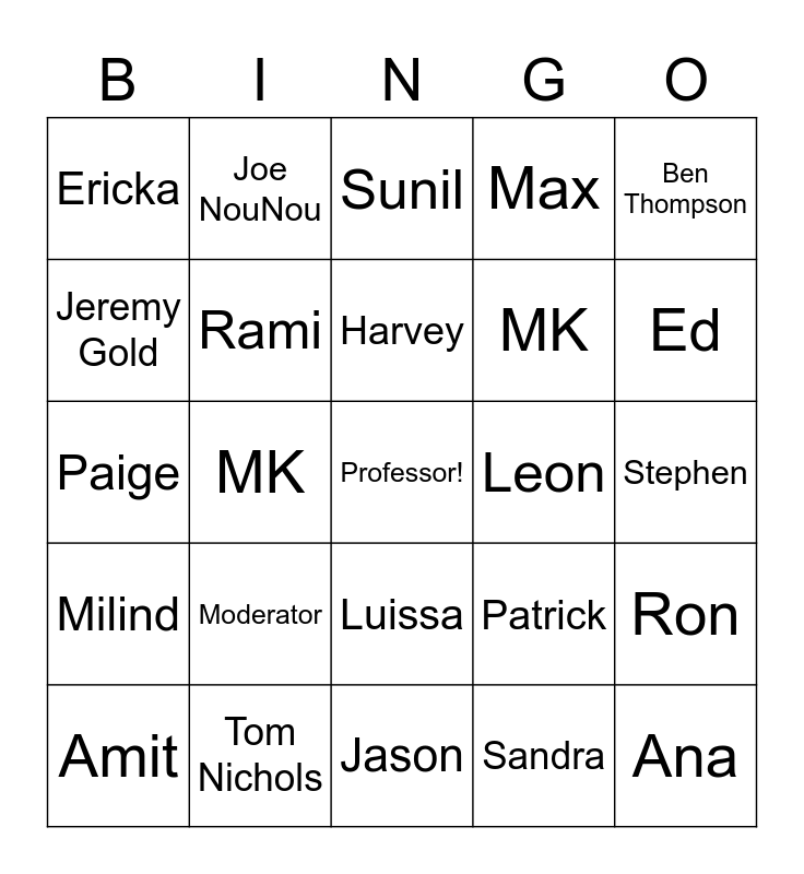 This bingo card has a free space and 24 words: Moderator, Tom Nichols, Harvey, Amit, Ben Thompson, Ericka, Jeremy Gold, Joe NouNou, Leon, Luissa, MK, Paige, Patrick, Ron, Rami, Sandra, Stephen, Sunil, Ed, MK, Ana, Milind, Max and Jason.