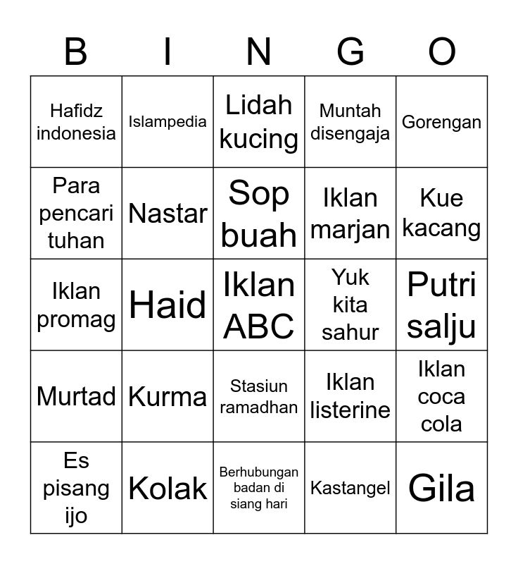 This bingo card has a free space and 24 words: Kurma, Kolak, Sop buah, Es pisang ijo, Gorengan, Hafidz indonesia, Para pencari tuhan, Islampedia, Yuk kita sahur, Stasiun ramadhan, Iklan marjan, Iklan promag, Iklan listerine, Iklan coca cola, Nastar, Kastangel, Putri salju, Lidah kucing, Kue kacang, Haid, Gila, Murtad, Muntah disengaja and Berhubungan badan di siang hari.