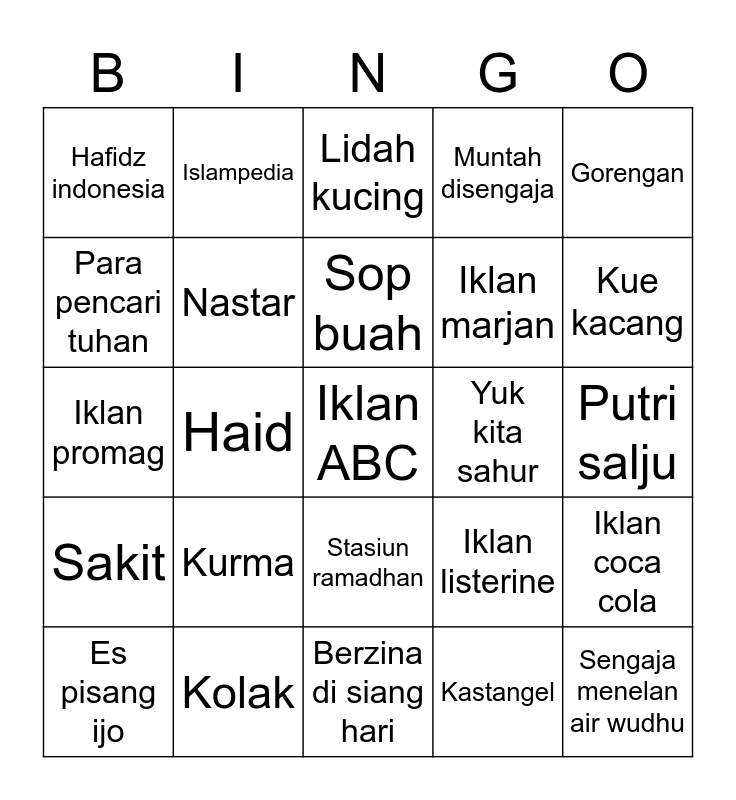 This bingo card has a free space and 24 words: Kurma, Kolak, Sop buah, Es pisang ijo, Gorengan, Hafidz indonesia, Para pencari tuhan, Islampedia, Yuk kita sahur, Stasiun ramadhan, Iklan marjan, Iklan promag, Iklan listerine, Iklan coca cola, Nastar, Kastangel, Putri salju, Lidah kucing, Kue kacang, Haid, Sengaja menelan air wudhu, Sakit, Muntah disengaja and Berzina di siang hari.