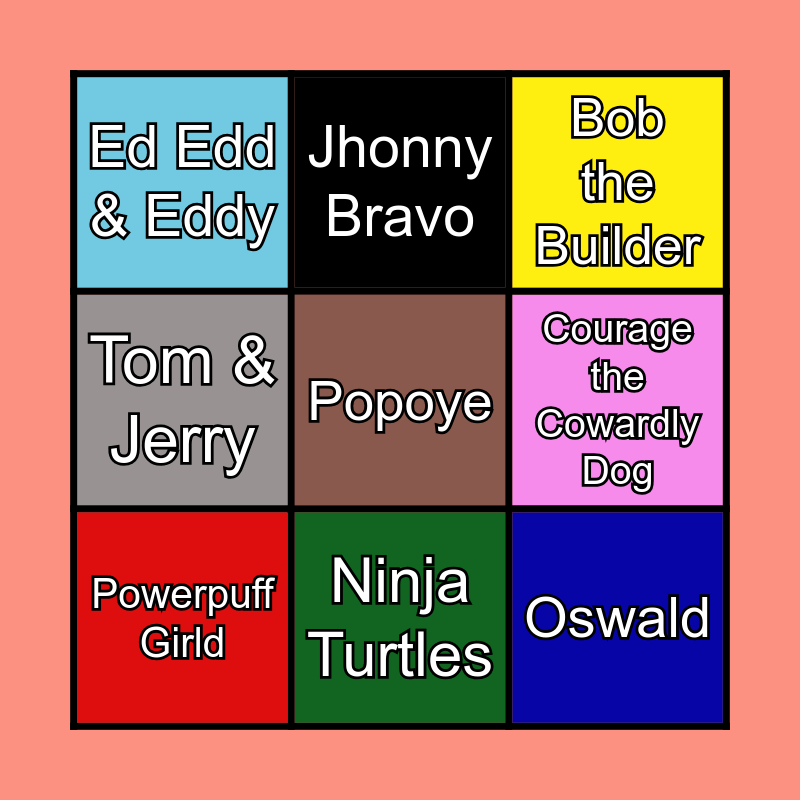 This bingo card has 9 words: Powerpuff Girld, Bob the Builder, Jhonny Bravo, Tom & Jerry, Ed Edd & Eddy, Courage the Cowardly Dog, Popoye, Oswald and Ninja Turtles.