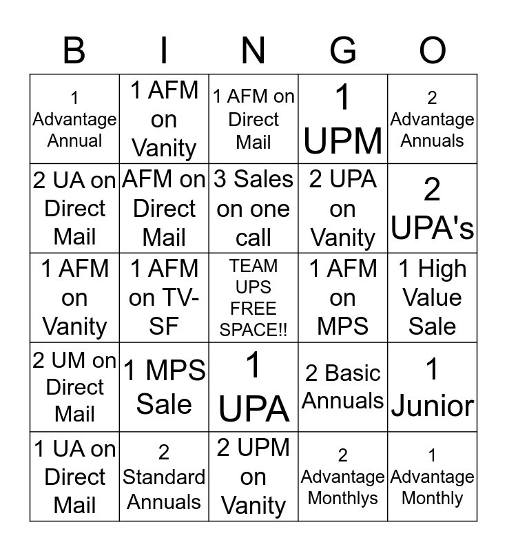 This bingo card has a free space and 24 words: 1 MPS Sale, 2 Standard Annuals, 3 Sales on one call, 1 UA on Direct Mail, 2 Advantage Annuals, 1 Advantage Annual, 2 UA on Direct Mail, 1 AFM on Vanity, 1 AFM on MPS, 1 UPA, 2 UPA on Vanity, 1 AFM on Vanity, 2 Basic Annuals, 1 Junior, AFM on Direct Mail, 2 Advantage Monthlys, 1 High Value Sale, 1 AFM on Direct Mail, 2 UPA's, 1 AFM on TV-SF, 1 Advantage Monthly, 2 UM on Direct Mail, 1 UPM and 2 UPM on Vanity.