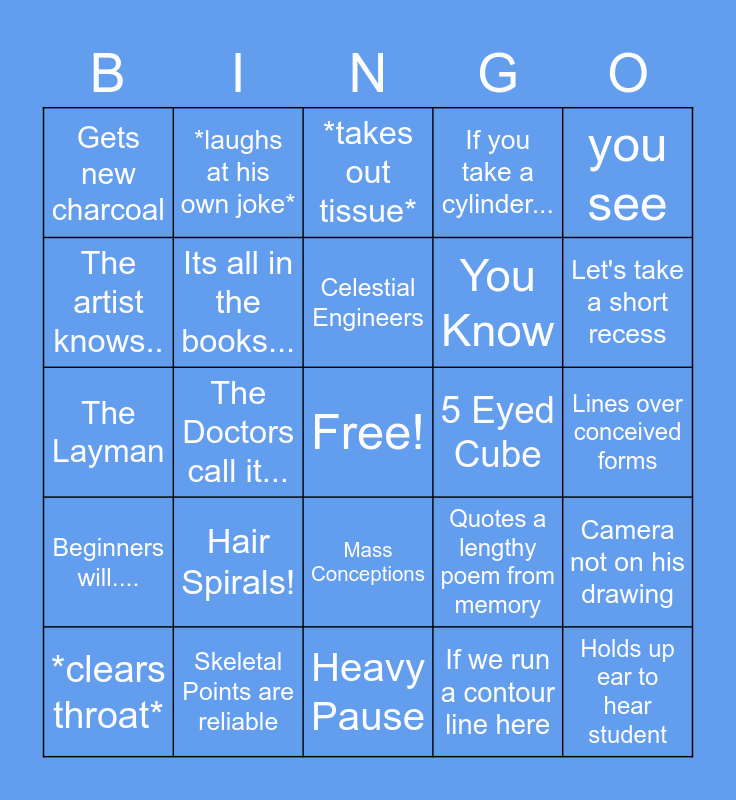 This bingo card has a free space and 24 words: Hair Spirals!, Skeletal Points are reliable, Celestial Engineers, *clears throat*, you see, Gets new charcoal, The artist knows.., *laughs at his own joke*, 5 Eyed Cube, Mass Conceptions, You Know, The Layman, Quotes a lengthy poem from memory, Camera not on his drawing, Its all in the books..., If we run a contour line here, Lines over conceived forms, *takes out tissue*, Let's take a short recess, The Doctors call it..., Holds up ear to hear student, Beginners will...., If you take a cylinder... and Heavy Pause.