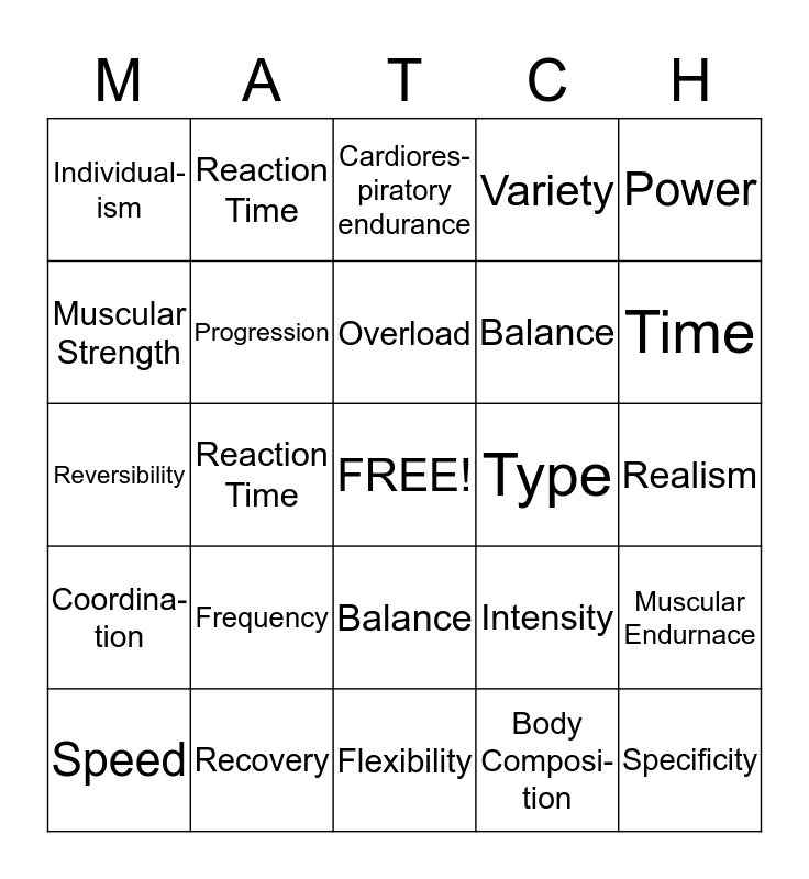 This bingo card has a free space and 24 words: Frequency, Recovery, Overload, Speed, Power, Individual- ism, Muscular Strength, Reaction Time, Type, Balance, Balance, Reversibility, Intensity, Muscular Endurnace, Progression, Body Composi- tion, Realism, Cardiores-piratory endurance, Time, Reaction Time, Specificity, Coordina- tion, Variety and Flexibility.