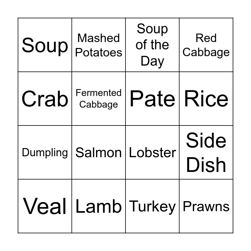This bingo card has 30 words: Starter, Main Course, Side Dish, Dessert, Soup, Soup of the Day, Pate, Beef, Lamb, Pork, Turkey, Veal, Mince, Chicken, Salmon, Tuna, Trout, Prawns, Squid, Crab, Lobster, Fried Potatoes, Mashed Potatoes, Dumpling, Fermented Cabbage, Red Cabbage, Vegetables, Chips, Rice and Custard.