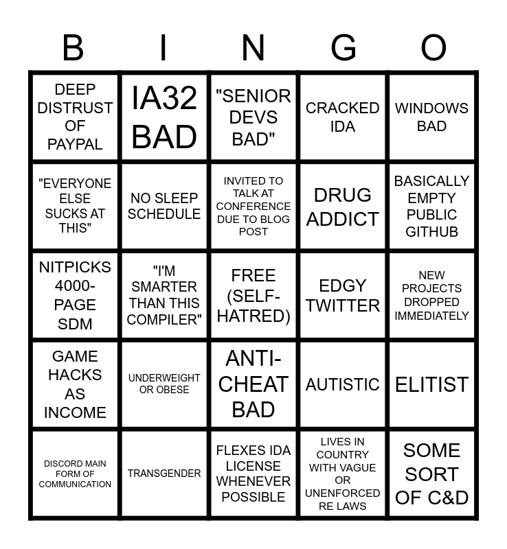 This bingo card has a free space and 27 words: AUTISTIC, WEEB, DRUG ADDICT, FLEXES IDA LICENSE WHENEVER POSSIBLE, "EVERYONE ELSE SUCKS AT THIS", "SENIOR DEVS BAD", IA32 BAD, GAME HACKS AS INCOME, EDGY TWITTER, ELITIST, NITPICKS 4000-PAGE SDM, CRACKED IDA, DISCORD MAIN FORM OF COMMUNICATION, TRANSGENDER, BASICALLY EMPTY PUBLIC GITHUB, PUBLIC PROJECTS ONLY PUBLIC FOR CLOUT, NO SLEEP SCHEDULE, INVITED TO TALK AT CONFERENCE DUE TO BLOG POST, UNDERWEIGHT OR OBESE, DEEP DISTRUST OF PAYPAL, NEW PROJECTS DROPPED IMMEDIATELY, LIVES IN COUNTRY WITH VAGUE OR UNENFORCED RE LAWS, "I'M SMARTER THAN THIS COMPILER", SOME SORT OF C&D, ANTI-CHEAT BAD, WINDOWS BAD and STARTED IN MIDDLE SCHOOL.