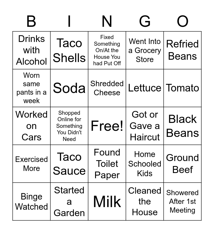 This bingo card has a free space and 24 words: Taco Sauce, Started a Garden, Shredded Cheese, Binge Watched, Refried Beans, Drinks with Alcohol, Worn same pants in a week, Taco Shells, Got or Gave a Haircut, Found Toilet Paper, Lettuce, Worked on Cars, Home Schooled Kids, Ground Beef, Soda, Cleaned the House, Black Beans, Fixed Something On/At the House You had Put Off, Tomato, Shopped Online for Something You Didn't Need, Showered After 1st Meeting, Exercised More, Went Into a Grocery Store and Milk.