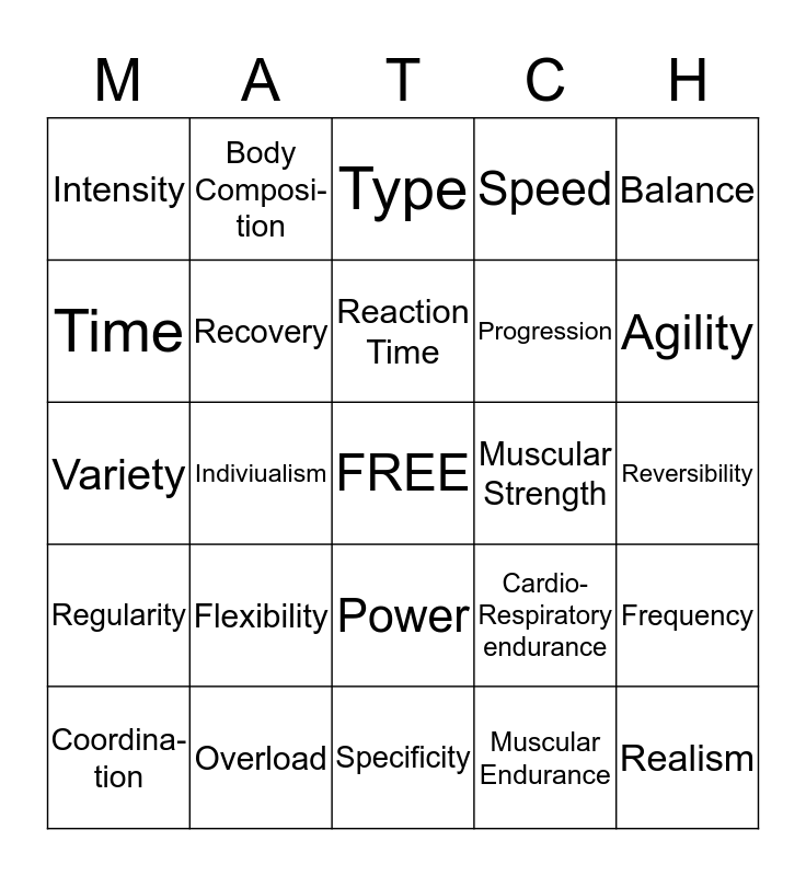 This bingo card has a free space and 24 words: Flexibility, Overload, Reaction Time, Coordina- tion, Balance, Intensity, Time, Body Composi- tion, Muscular Strength, Power, Progression, Variety, Cardio- Respiratory endurance, Frequency, Recovery, Muscular Endurance, Reversibility, Type, Agility, Indiviualism, Realism, Regularity, Speed and Specificity.
