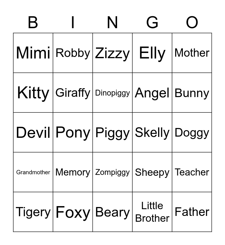 This bingo card has a free space and 24 words: Memory, Foxy, Dinopiggy, Tigery, Mother, Mimi, Kitty, Robby, Skelly, Zompiggy, Angel, Devil, Sheepy, Teacher, Giraffy, Little Brother, Doggy, Zizzy, Bunny, Pony, Father, Grandmother, Elly and Beary.