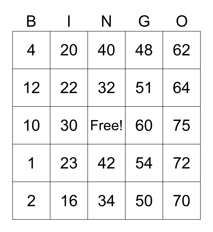 This bingo card has a free space and 24 words: 2, 23, 32, 50, 62, 4, 20, 40, 60, 75, 10, 22, 54, 72, 12, 16, 34, 48, 64, 1, 30, 42, 51 and 70.