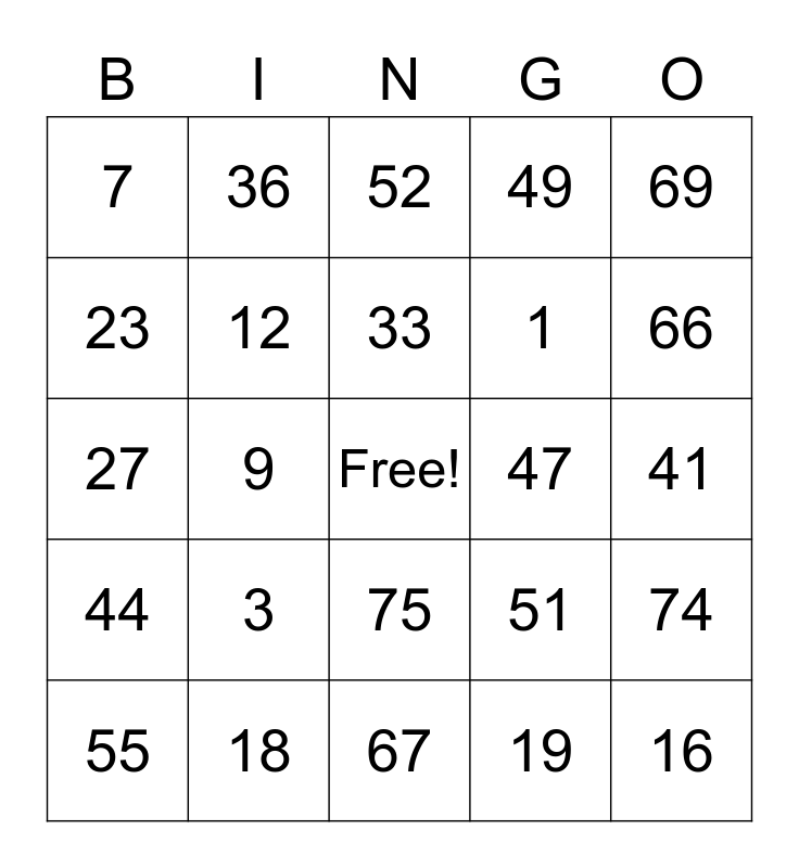 This bingo card has a free space and 24 words: 3, 18, 33, 55, 69, 7, 23, 36, 47, 75, 1, 27, 51, 74, 12, 19, 41, 52, 66, 9, 16, 44, 49 and 67.