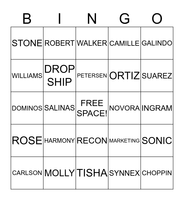 This bingo card has a free space and 24 words: HARMONY, MOLLY, PETERSEN, CARLSON, GALINDO, STONE, WILLIAMS, ROBERT, NOVORA, RECON, ORTIZ, DOMINOS, MARKETING, SONIC, DROP SHIP, SYNNEX, INGRAM, WALKER, SUAREZ, SALINAS, CHOPPIN, ROSE, CAMILLE and TISHA.