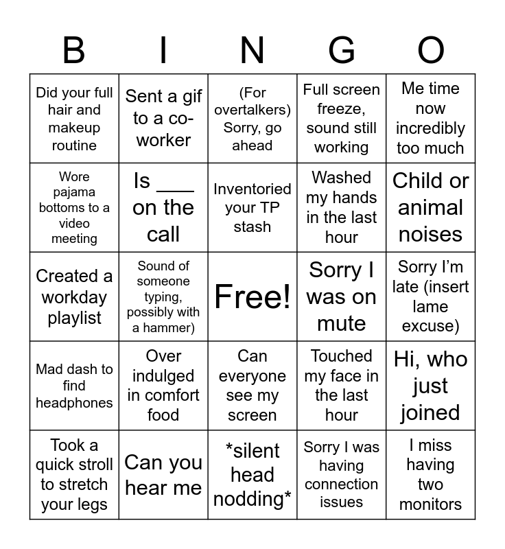 This bingo card has a free space and 24 words: Over indulged in comfort food, Can you hear me, Inventoried your TP stash, Took a quick stroll to stretch your legs, Me time now incredibly too much, Did your full hair and makeup routine, Wore pajama bottoms to a video meeting, Sent a gif to a co-worker, Sorry I was on mute, Can everyone see my screen, Washed my hands in the last hour, Created a workday playlist, Touched my face in the last hour, Hi, who just joined, Is ___ on the call, Sorry I was having connection issues, Sorry I’m late (insert lame excuse), (For overtalkers) Sorry, go ahead, Child or animal noises, Sound of someone typing, possibly with a hammer), I miss having two monitors, Mad dash to find headphones, Full screen freeze, sound still working and *silent head nodding*.