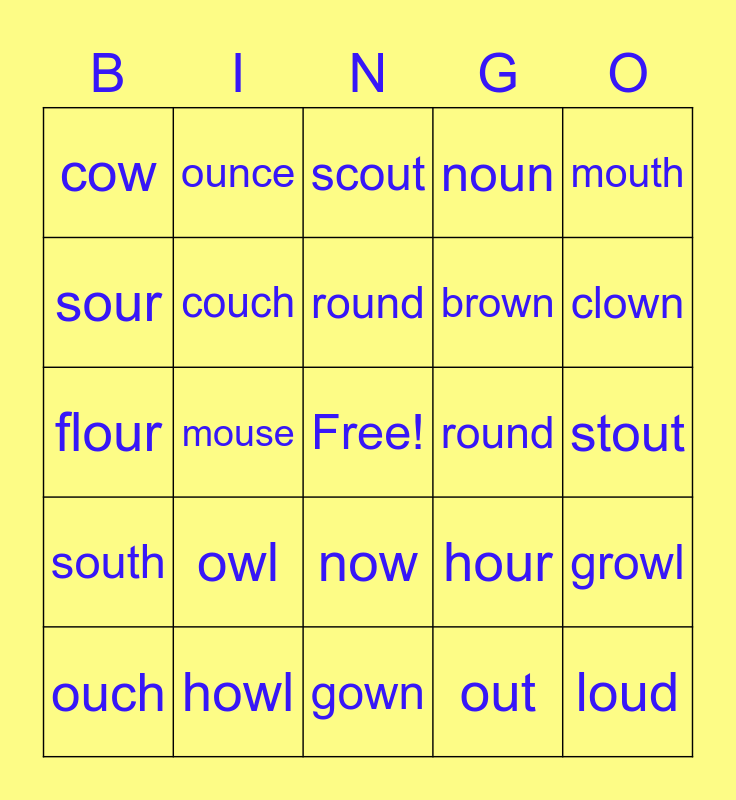 This bingo card has a free space and 29 words: ouch, drown, mouse, found, cow, scout, couch, owl, round, howl, stout, loud, gown, out, clown, vow, now, south, mouth, flour, hour, down, brown, sour, noun, ounce, growl, round and proud.