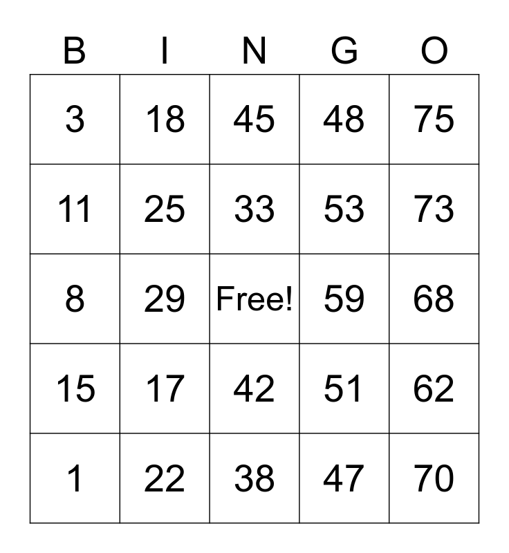 This bingo card has a free space and 24 words: 1, 17, 33, 47, 75, 3, 18, 45, 59, 68, 8, 25, 51, 62, 11, 22, 38, 48, 73, 15, 29, 42, 53 and 70.