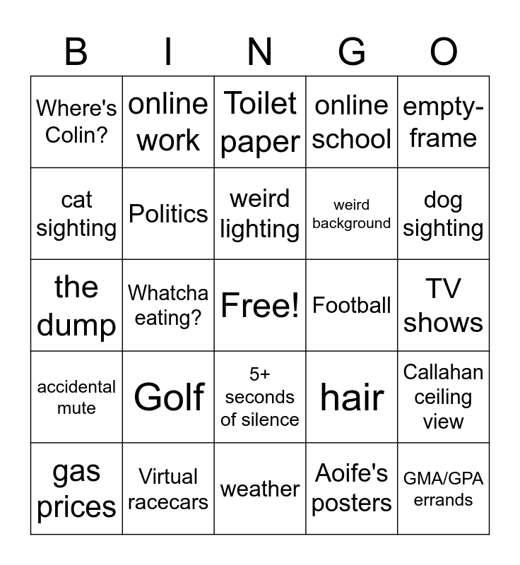 This bingo card has a free space and 29 words: gas prices, cancellations, Whatcha eating?, GMA nap, Where's Colin?, Toilet paper, Politics, Golf, Football, Virtual racecars, TV shows, GMA/GPA errands, weather, Aoife's posters, dog sighting, GMA swat & exit, 5+ seconds of silence, accidental mute, empty-frame, the dump, hair, movies, weird background, cat sighting, online school, online work, Callahan ceiling view, weird lighting and Dave Jr. no video.