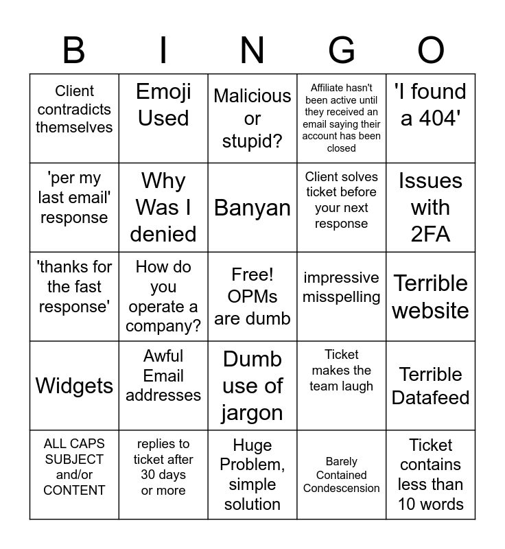 This bingo card has a free space and 24 words: Awful Email addresses, replies to ticket after 30 days or more, Banyan, ALL CAPS SUBJECT and/or CONTENT, 'I found a 404', Client contradicts themselves, 'per my last email' response, Emoji Used, impressive misspelling, Dumb use of jargon, Client solves ticket before your next response, 'thanks for the fast response', Ticket makes the team laugh, Terrible Datafeed, Why Was I denied, Barely Contained Condescension, Terrible website, Malicious or stupid?, Issues with 2FA, How do you operate a company?, Ticket contains less than 10 words, Widgets, Affiliate hasn't been active until they received an email saying their account has been closed and Huge Problem, simple solution.