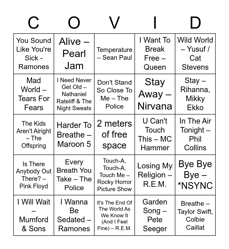 This bingo card has a free space and 40 words: Day Drinking – Little Big Town, Harder To Breathe – Maroon 5, Unwell - Matchbox Twenty, U Can't Touch This – MC Hammer, Breathe – Michelle Branch, I Will Wait – Mumford & Sons, I Need Never Get Old – Nathaniel Rateliff & The Night Sweats, Hot In Herre – Nelly, Stay Away – Nirvana, Bye Bye Bye – *NSYNC, The Kids Aren't Alright – The Offspring, Alive – Pearl Jam, Garden Song – Pete Seeger, In The Air Tonight – Phil Collins, Is There Anybody Out There? – Pink Floyd, Every Breath You Take – The Police, Fever – Peggy Lee, I Want To Break Free – Queen, Under Pressure – Queen, David Bowie, You Sound Like You're Sick - Ramones, I Wanna Be Sedated – Ramones, Don't Stand So Close To Me – The Police, Losing My Religion – R.E.M., Stay – Rihanna, Mikky Ekko, Gimme Shelter – The Rolling Stones, Escape (The Pina Colada Song) – Rupert Holmes, It's The End Of The World As We Know It (And I Feel Fine) – R.E.M., Closing Time – Semisonic, Party For Two - Shania Twain, Billy Currington, The Sound of Silence -Simon & Garfunkel, In Too Deep – Sum 41, Temperature – Sean Paul, Psycho Killer – Talking Heads, Breathe – Taylor Swift, Colbie Caillat, Mad World – Tears For Fears, I Think We're Alone Now – Tiffany, Touch-A, Touch-A, Touch Me – Rocky Horror Picture Show, Saving All My Love for You – Whitney Houston, Wild World – Yusuf / Cat Stevens and The Waiting – Tom Petty and the Heartbreakers.