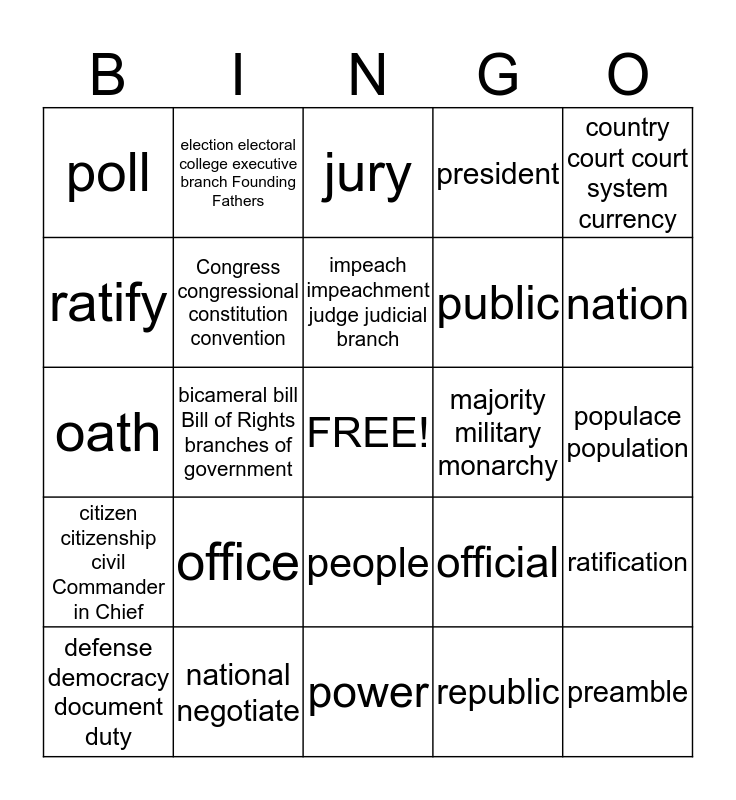 This bingo card has a free space and 33 words: allegiance amend amendment appoint, army article assembly ballot, bicameral bill Bill of Rights branches of government, cabinet census checks and balances Chief Executive, citizen citizenship civil Commander in Chief, Congress congressional constitution convention, country court court system currency, defense democracy document duty, election electoral college executive branch Founding Fathers, framers freedom government House of Representatives, impeach impeachment judge judicial branch, jury, legislative branch liberty, Magna Carta, majority military monarchy, nation, national negotiate, oath, office, official, people, pledge, poll, populace population, power, preamble, president, public, ratify, ratification, regulate regulation representative, republic and responsibility revenue.