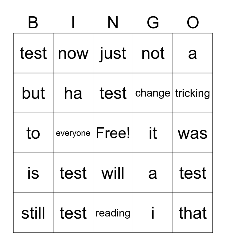 This bingo card has a free space and 24 words: test, test, test, still, a, test, but, now, it, will, change, to, a, test, ha, i, was, just, tricking, everyone, that, is, not and reading.
