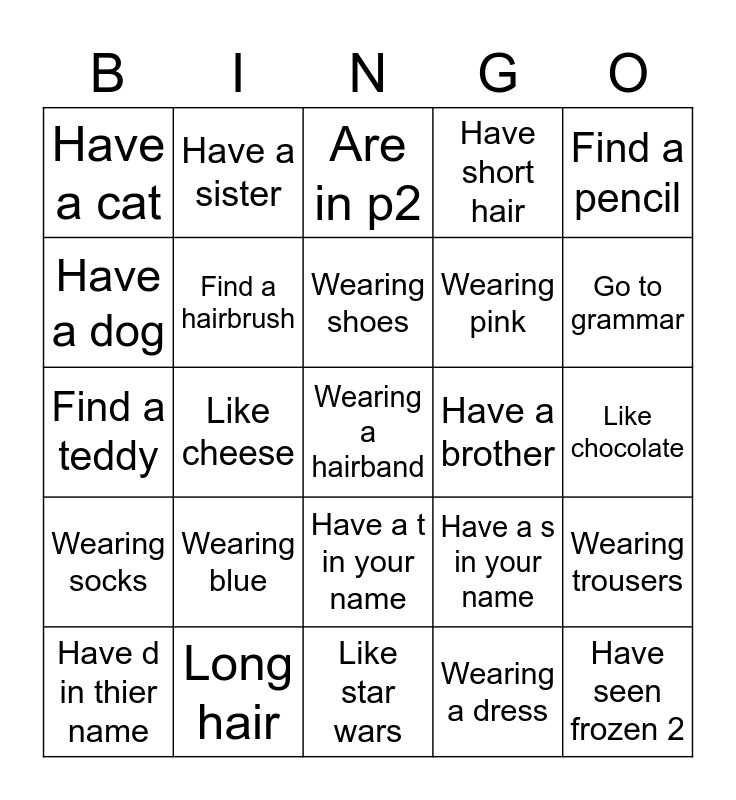 This bingo card has a free space and 24 words: Wearing blue, Long hair, Wearing shoes, Have d in thier name, Find a pencil, Have a cat, Have a dog, Have a sister, Have a brother, Have a t in your name, Wearing pink, Find a teddy, Have a s in your name, Wearing trousers, Find a hairbrush, Wearing a dress, Like chocolate, Are in p2, Go to grammar, Like cheese, Have seen frozen 2, Wearing socks, Have short hair and Like star wars.