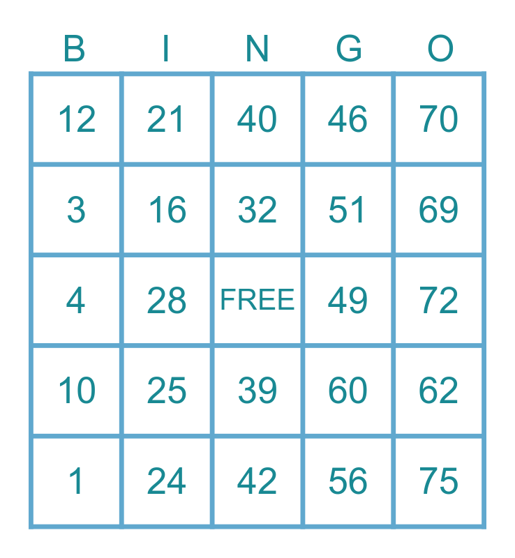 This bingo card has a free space and 24 words: 1, 25, 32, 56, 70, 12, 21, 40, 49, 72, 4, 16, 60, 62, 3, 24, 42, 46, 69, 10, 28, 39, 51 and 75.
