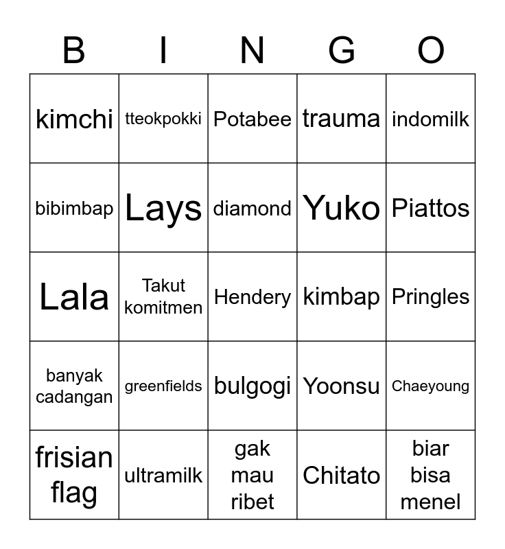 This bingo card has a free space and 24 words: greenfields, ultramilk, diamond, frisian flag, indomilk, kimchi, bibimbap, tteokpokki, kimbap, bulgogi, Yuko, Lala, Yoonsu, Chaeyoung, Lays, Chitato, Pringles, Potabee, Piattos, Takut komitmen, biar bisa menel, banyak cadangan, trauma and gak mau ribet.