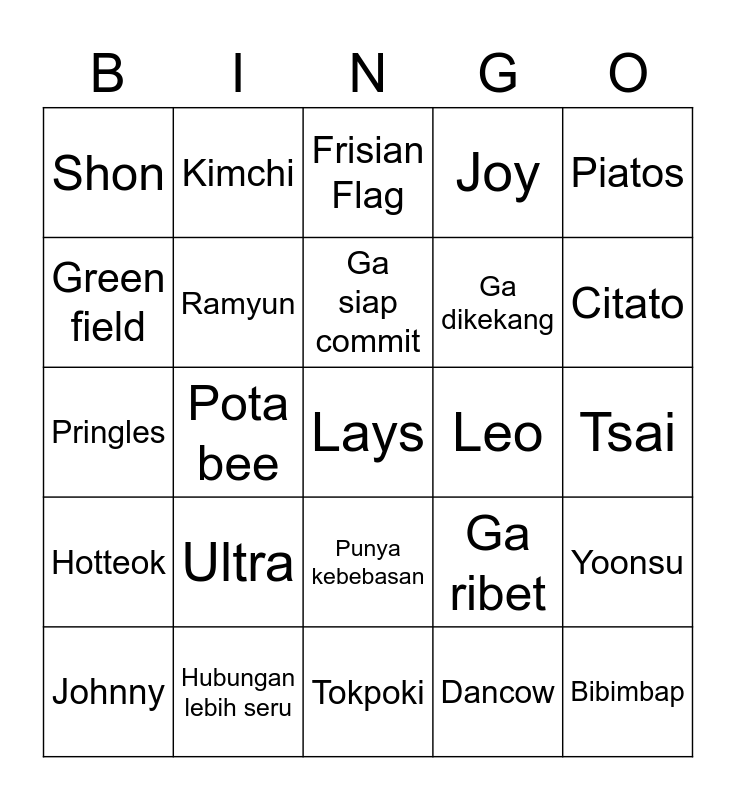 This bingo card has 25 words: Ultra, Tokpoki, Ga siap commit, Johnny, Piatos, Shon, Green field, Kimchi, Leo, Punya kebebasan, Ga dikekang, Pringles, Ga ribet, Yoonsu, Ramyun, Bibimbap, Tsai, Frisian Flag, Citato, Pota bee, Lays, Hubungan lebih seru, Hotteok, Joy and Dancow.