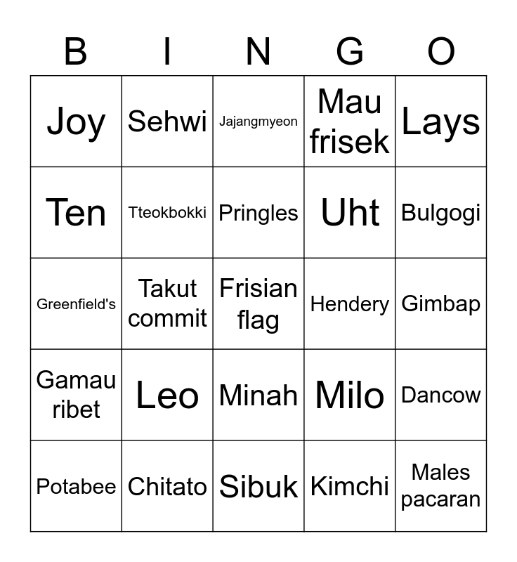 This bingo card has a free space and 24 words: Leo, Chitato, Pringles, Potabee, Lays, Joy, Ten, Sehwi, Hendery, Minah, Uht, Greenfield's, Milo, Dancow, Tteokbokki, Kimchi, Gimbap, Jajangmyeon, Bulgogi, Takut commit, Males pacaran, Gamau ribet, Mau frisek and Sibuk.