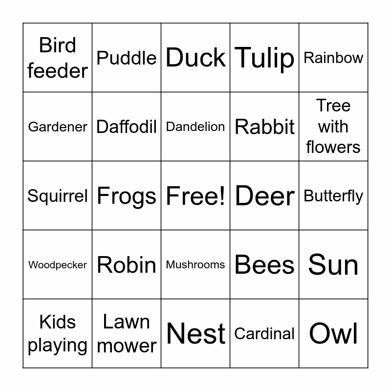 This bingo card has a free space and 24 words: Robin, Lawn mower, Dandelion, Kids playing, Rainbow, Bird feeder, Gardener, Puddle, Deer, Mushrooms, Rabbit, Squirrel, Bees, Sun, Daffodil, Cardinal, Butterfly, Duck, Tree with flowers, Frogs, Owl, Woodpecker, Tulip and Nest.