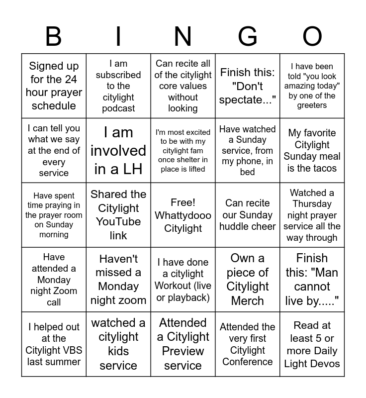 This bingo card has a free space and 30 words: watched a citylight kids service, Participated in Marks pub drive thru delivery, Shared the Citylight YouTube link, Follow Citylight on Instagram or FB, Signed up for the 24 hour prayer schedule, Can recite all of the citylight core values without looking, I am involved in a LH, I have done a citylight Workout (live or playback), Can recite our Sunday huddle cheer, Attended a Citylight Preview service, Watched a Thursday night prayer service all the way through, Read at least 5 or more Daily Light Devos, Attended the very first Citylight Conference, My favorite Citylight sunday meal is the chicken and rice, My favorite Citylight Sunday meal is the tacos, Have served at least once in Citylight Kids - The real MVPs, Own a piece of Citylight Merch, Have attended a Monday night Zoom call, Haven't missed a Monday night zoom, I have been told "you look amazing today" by one of the greeters, Have spent time praying in the prayer room on Sunday morning, I was at the Citylight launch service (can you name the launch date?), I am subscribed to the citylight podcast, Have watched a Sunday service, from my phone, in bed, I can tell you what we say at the end of every service, Finish this: "Don't spectate...", Finish this: "Man cannot live by.....", I helped out at the Citylight VBS last summer, I'm most excited to be with my citylight fam once shelter in place is lifted and I have dropped off left over snacks or food at the Citylight Coffee table on a Sunday.