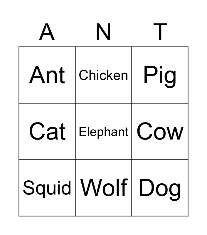 This bingo card has a free space and 8 words: Cow, Pig, Chicken, Squid, Ant, Dog, Cat and Wolf.