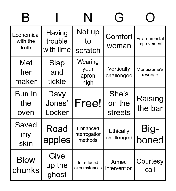 This bingo card has a free space and 28 words: Big-boned, Between jobs, Vertically challenged, Armed intervention, Met her maker, Not up to scratch, Having trouble with time, Saved my skin, She’s on the streets, Blow chunks, Bun in the oven, Comfort woman, Give up the ghost, In reduced circumstances, Montezuma’s revenge, One sandwich short of a picnic, Road apples, Slap and tickle, Wearing your apron high, Enhanced interrogation methods, Economical with the truth, Truth verification module, Courtesy call, Davy Jones’ Locker, Raising the bar, Ethically challenged, Environmental improvement and Unmentionables.