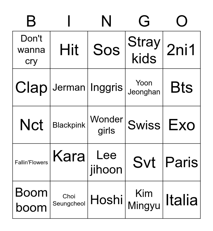 This bingo card has a free space and 24 words: Kara, Choi Seungcheol, Inggris, Boom boom, 2ni1, Don't wanna cry, Clap, Hit, Swiss, Lee jihoon, Yoon Jeonghan, Nct, Svt, Paris, Jerman, Kim Mingyu, Exo, Sos, Bts, Blackpink, Italia, Fallin'Flowers, Stray kids and Hoshi.