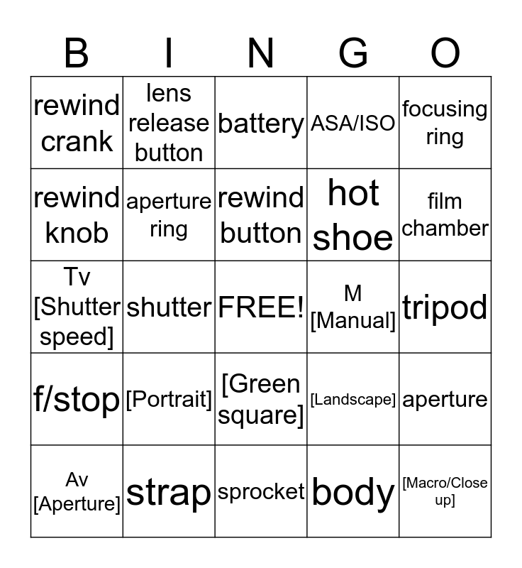 This bingo card has a free space and 32 words: body, lens, shutter, shutter speed, f/stop, aperture ring, focusing ring, aperture, lens release button, shutter release, rewind button, battery, film, flash [X], M [Manual], P [Program], Av [Aperture], Tv [Shutter speed], [Green square], [Portrait], [Landscape], [Sports], tripod, strap, [Macro/Close up], ASA/ISO, hot shoe, rewind knob, rewind crank, sprocket, take-up reel and film chamber.