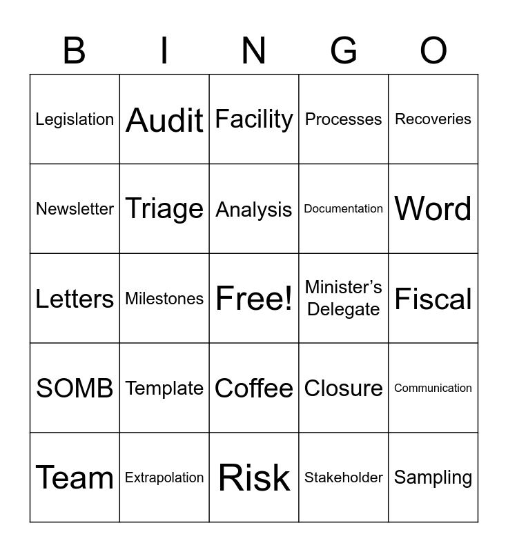 This bingo card has a free space and 63 words: Compliance, Monitoring, Computer, Communication, Policy, Healthcare, Audit, Business, Analysis, Interpersonal, Coffee, Tea, Fiscal, Recoveries, Data, Newsletter, Milestones, Legislation, Leadership, Documentation, Template, SOMB, Processes, Claims, Laptop, Email, Keyboard, Printer, Scanner, Medical Records, Practitioner, Ergonomics, Excel, Collaboration, Word, Team, Meetings, Stakeholder, Review, Triage, Letters, Minister’s Delegate, Report, Government, Sampling, Extrapolation, Statistics, Closure, Details, License, Specialty, Risk, Legal, Onsite, Clinical, Facility, Act, Regulation, Coordinate, Non-compliance, Inspection, Investigation and Snacks.