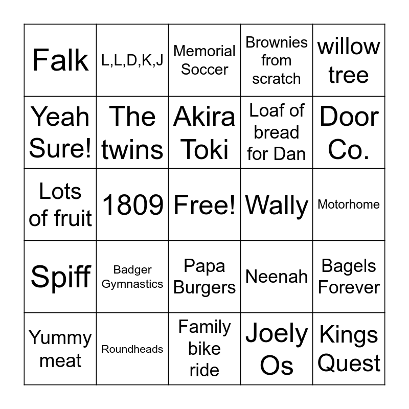 This bingo card has a free space and 34 words: Wudge, 6605, Hidden Treasures Cereal, Peppler7, Motorhome, Yeah Sure!, The twins, Family bike ride, Loaf of bread for Dan, Kings Quest, Lots of fruit, L,L,D,K,J, Joely Os, Cory's breakfast cake, Spiff, 1809, Papa Burgers, Wally, Bagels Forever, Yummy meat, Roundheads, Gulf Shores, Brownies from scratch, Door Co., Pep & Blondie, Badger Gymnastics, Memorial Soccer, Pearl Snap, willow tree, Falk, JMM, Akira Toki, Neenah and Camp Allen.