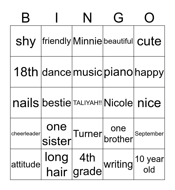 This bingo card has a free space and 24 words: one sister, long hair, music, attitude, cute, shy, 18th, friendly, Nicole, Turner, piano, nails, one brother, September, dance, writing, nice, Minnie, happy, bestie, 10 year old, cheerleader, beautiful and 4th grade.