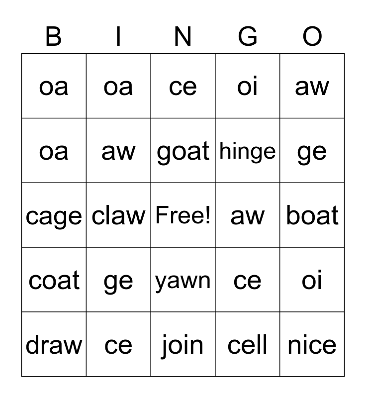This bingo card has a free space and 48 words: aw, ce, oi, ge, ge, ce, oa, oa, aw, oa, oa, aw, ce, oi, ce, oi, ce, ce, oa, oa, ge, join, oi, aw, law, claw, goat, coin, boat, coat, soak, toad, soil, boil, draw, flaw, large, cell, nice, dance, germ, yawn, hinge, prince, cage, fence, lawn and coach.