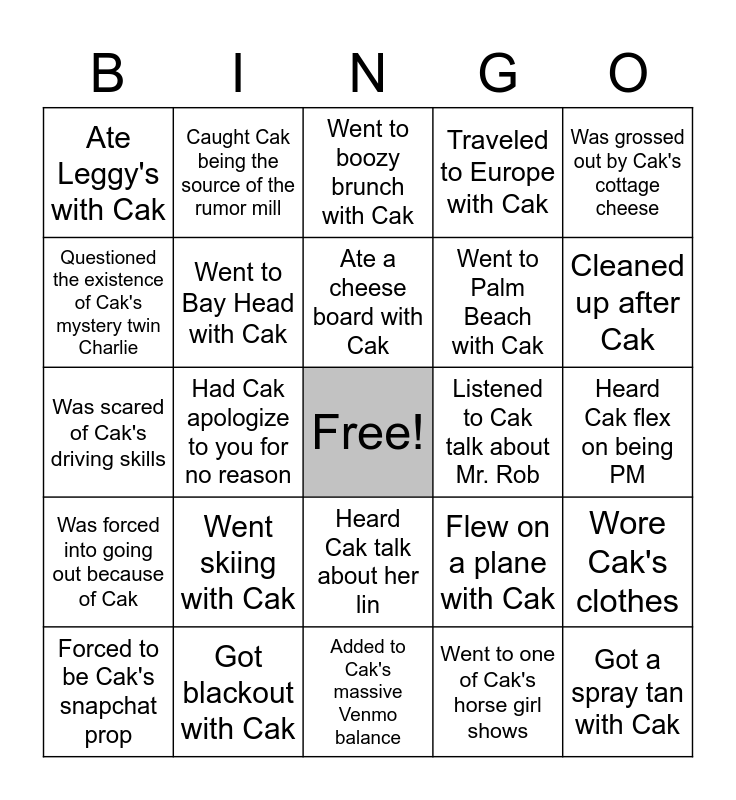 This bingo card has a free space and 24 words: Went skiing with Cak, Got blackout with Cak, Ate a cheese board with Cak, Forced to be Cak's snapchat prop, Was grossed out by Cak's cottage cheese, Ate Leggy's with Cak, Questioned the existence of Cak's mystery twin Charlie, Caught Cak being the source of the rumor mill, Listened to Cak talk about Mr. Rob, Heard Cak talk about her lin, Went to Palm Beach with Cak, Was scared of Cak's driving skills, Flew on a plane with Cak, Wore Cak's clothes, Went to Bay Head with Cak, Went to one of Cak's horse girl shows, Heard Cak flex on being PM, Went to boozy brunch with Cak, Cleaned up after Cak, Had Cak apologize to you for no reason, Got a spray tan with Cak, Was forced into going out because of Cak, Traveled to Europe with Cak and Added to Cak's massive Venmo balance.