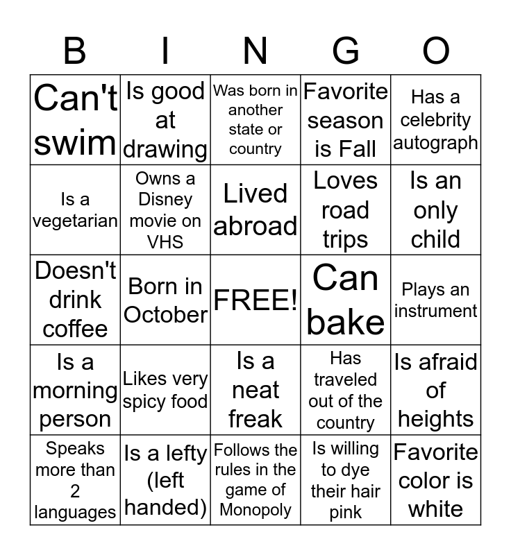 This bingo card has a free space and 24 words: Likes very spicy food, Is a lefty (left handed), Lived abroad, Speaks more than 2 languages, Has a celebrity autograph, Can't swim, Is a vegetarian, Is good at drawing, Can bake, Is a neat freak, Loves road trips, Doesn't drink coffee, Has traveled out of the country, Is afraid of heights, Owns a Disney movie on VHS, Is willing to dye their hair pink, Plays an instrument, Was born in another state or country, Is an only child, Born in October, Favorite color is white, Is a morning person, Favorite season is Fall and Follows the rules in the game of Monopoly.