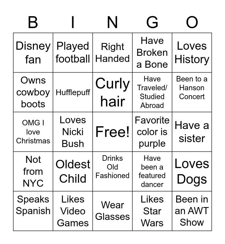 This bingo card has a free space and 24 words: Oldest Child, Likes Video Games, Curly hair, Speaks Spanish, Loves History, Disney fan, Owns cowboy boots, Played football, Favorite color is purple, Drinks Old Fashioned, Have Traveled/ Studied Abroad, OMG I love Christmas, Have been a featured dancer, Loves Dogs, Hufflepuff, Likes Star Wars, Have a sister, Right Handed, Been to a Hanson Concert, Loves Nicki Bush, Been in an AWT Show, Not from NYC, Have Broken a Bone and Wear Glasses.