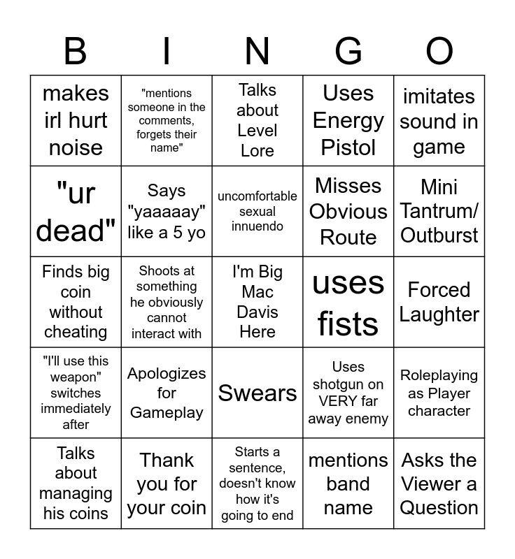 This bingo card has a free space and 25 words: Apologizes for Gameplay, Starts a sentence, doesn't know how it's going to end, uncomfortable sexual innuendo, Talks about managing his coins, imitates sound in game, makes irl hurt noise, "ur dead", "mentions someone in the comments, forgets their name", uses fists, Swears, Misses Obvious Route, Finds big coin without cheating, Uses shotgun on VERY far away enemy, Roleplaying as Player character, Says "yaaaaay" like a 5 yo, Falls to death missing easy platform jump, Forced Laughter, Talks about Level Lore, Mini Tantrum/ Outburst, Shoots at something he obviously cannot interact with, Asks the Viewer a Question, Thank you for your coin, "I'll use this weapon" switches immediately after, Uses Energy Pistol and mentions band name.
