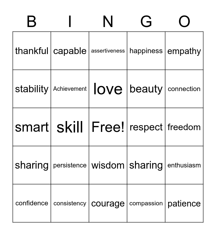 This bingo card has a free space and 44 words: Acceptance, patience, trust, confidence, motivation, compassion, assertiveness, hope, empathy, consistency, happiness, respect, wisdom, persistence, equality, courage, maturity, smart, power, connection, capable, fearless, justice, thankful, reliable, freedom, logic, vision, sharing, sharing, independence, enthusiasm, reason, meaning, skill, strength, dedication, peace, love, stability, beauty, kindness, Achievement and discipline.