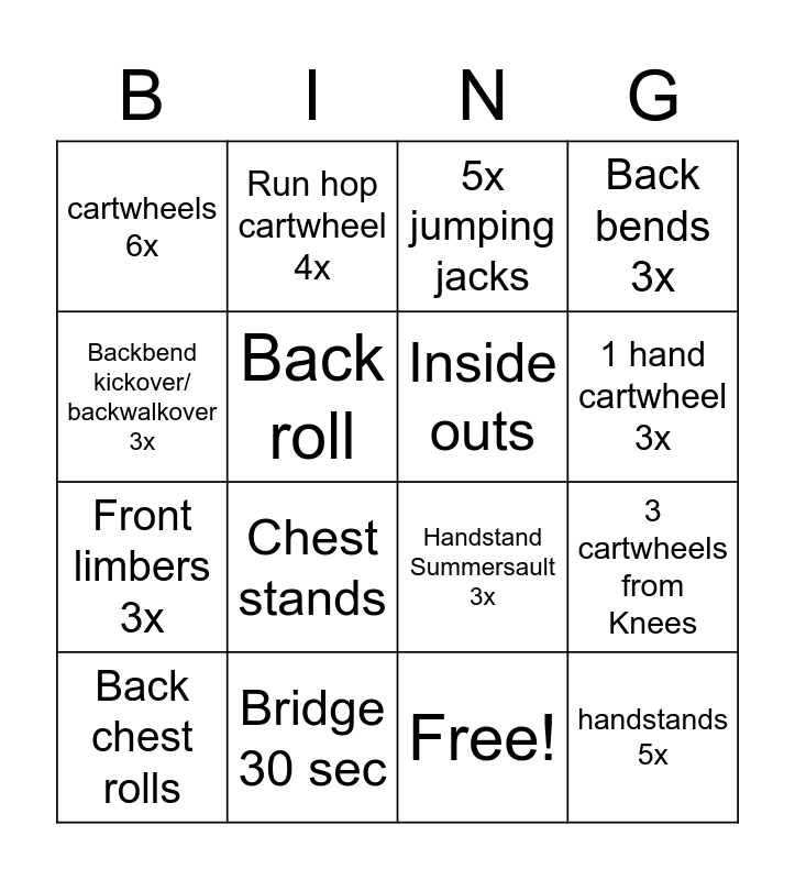 This bingo card has 21 words: Bridge 30 sec, Crabwalks 30 sec, Run hop cartwheel 4x, 20 second plank, Free!, Inside outs, cartwheels 6x, 5x jumping jacks, Handstand Summersault 3x, 1 hand cartwheel 3x, Front limbers 3x, Back bends 3x, handstands 5x, Round off rebound 3x, Back roll, Run hop round off 4x, Back chest rolls, Chest stands, Backbend kickover/ backwalkover 3x, 3 cartwheels from Knees and Splits 15 sec.