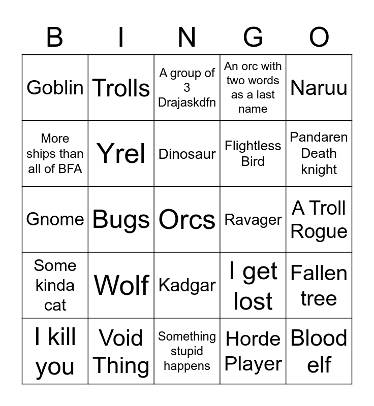 This bingo card has a free space and 24 words: Wolf, Void Thing, Dinosaur, I kill you, Naruu, Goblin, More ships than all of BFA, Trolls, Ravager, Kadgar, Flightless Bird, Gnome, I get lost, Fallen tree, Yrel, Horde Player, A Troll Rogue, A group of 3 Drajaskdfn, Pandaren Death knight, Bugs, Blood elf, Some kinda cat, An orc with two words as a last name and Something stupid happens.